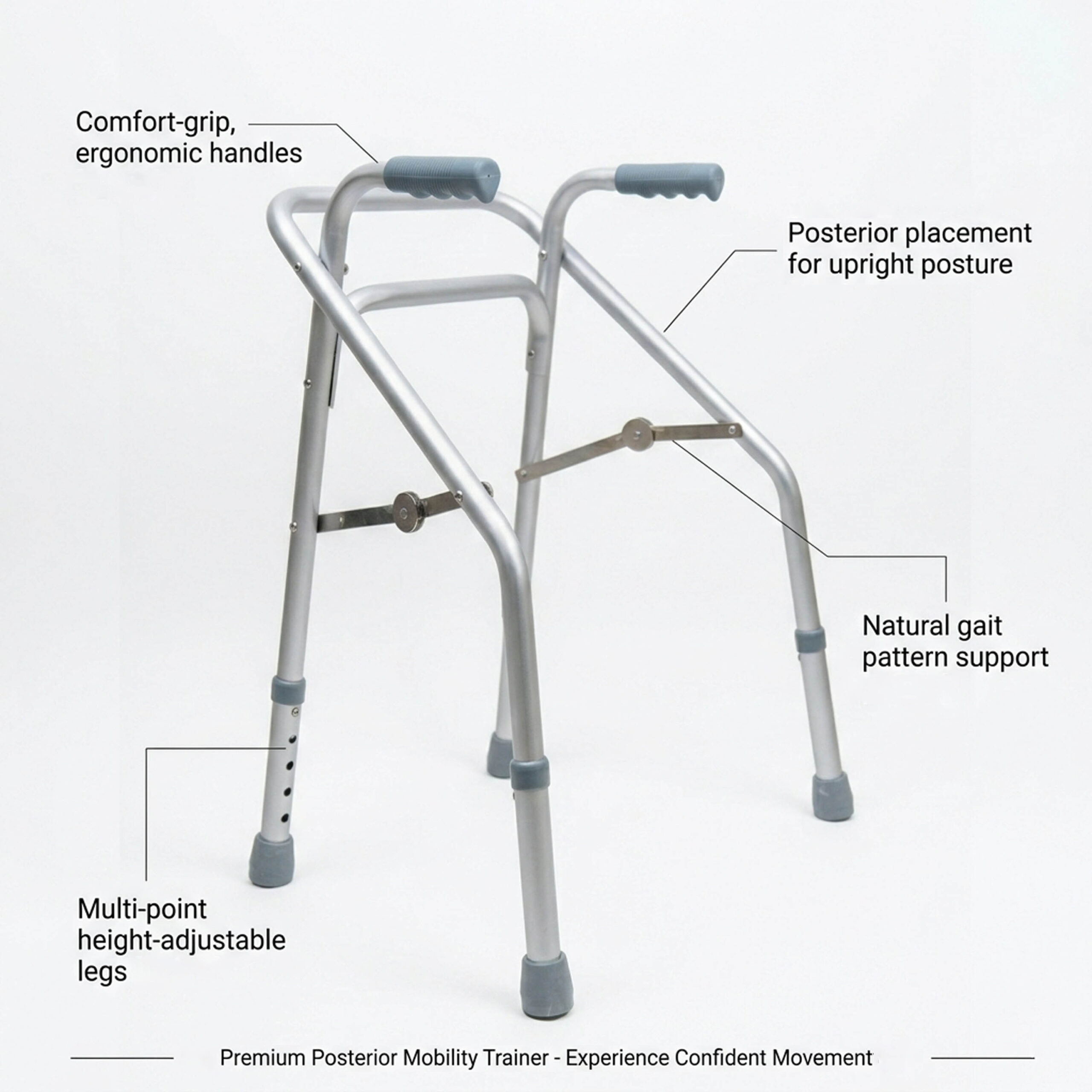 Encourage independent movement with our Premium Posterior Mobility Trainer. Designed specifically for children, this walker features posterior placement to promote an upright posture and support a natural gait pattern. With its multi-point height-adjustable legs and ergonomic comfort-grip handles, it provides the stability needed for confident movement.